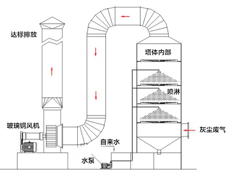 針對不同的廢氣成分選擇合適的處理方式是廢氣處理的基本,如上圖則是一張較為直觀的凈化流程。如果目的是清除廢氣中所含的灰塵,則在塔體內部加入自來水即可,如果在廢氣中含有酸性成分,則需要將自來水更換為堿溶液(NaOH)。