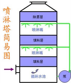 以玻璃鋼酸霧吸收塔(屬于噴淋塔的一例)為例,酸霧廢氣由風管引入凈化塔,經過填料層,廢氣與吸收液進行氣液兩相充分接觸吸收中和反應,酸霧廢氣經過凈化后,再經除霧板脫水除霧后由風機排入大氣。吸收液在塔底經水泵增壓后在塔頂噴淋而下,最后回流至塔底循環使用。